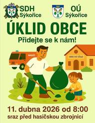 Přijďte se zapojit do akce „Úklid obce“ v Sýkořici, která se koná 11. dubna 2026 od 8:00. Sraz bude před hasičskou zbrojnicí, kde se sejdeme a společně domluvíme trasu úklidu. Rukavice, pytle na odpad a občerstvení zajištěno.