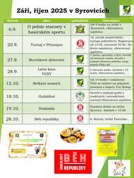 Kulturně-vzdělávací komise obce Syrovice pořádá v sobotu 27. 9. 2025 v obecním parku Burčákové dýňování. Sraz dobrovolníků na stavění stanů je v 9. hodin. Od 14 hodin bude následovat soutěž o nejlepší dýňovou polévku, ochutnávka dýňových specialit a také burčák od syrovských vinařů. Pro děti budou připraveny dílničky, kde si mohou namalovat, popřípadě vydlabat dýňáčka (omezený počet dýní k dispozici). K poslechu zahraje syrovská kapela Přídu Dýl. Přijďte si užít podzimní rodinné odpoledne. Kulturní komise obce pořádá v neděli 28. 9. 2025 letní kino. Na programu je český film - VLNY. Začátek promítaní v 19. hod v obecním parku. Vstupné 100 Kč. Občerstvení zajištěno. Dětská lékařka MUDr. Hana Jarošová oznamuje, že z důvodu dovolené příští týden v Syrovicích nebude ordinovat. Zastoupí ji MUDr. Habrová v Rajhradě. Nově otevřený květinový koutek Janečková nabízí prodej květin, podzimních dekorací, vazeb svatebních, smutečních, dušičkových. Vše se bude odvíjet od objednávky. Najdete nás na adrese: Syrovice 229 (Pastvisko), FB stránky: Květinový koutek Janečková, telefonní číslo 774 366 298.