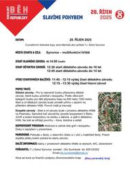 Sokol Syrovice pořádá v úterý 28. 10. 2025 Sokolský běh republiky. Už jen pár dní a online registrace na Sokolský běh republiky budou u konce. Proto se registrujte na běh v Syrovicích na webových stránkách Sokolského běhu do pátku 24. 10. 2025. Startovné: dospělí 200 Kč, děti 70 Kč. Registrace v den závodu bude možná v omezené míře a bez startovního balíčku. Společně oslavíme výročí naší republiky 28. října pohybem. Srdečně vás zve Sokol Syrovice.