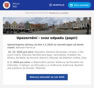 Upozorňujeme občany, že dne 1.1.2026 se nesváží papír od domácností. Náhradní termín je: 31. 12. 2025 pro ulice: Palackého, Náměstí Zachariáše z Hradce, U Masných krámů, Židovská, Náměstí Jana Kypty, Seminářská, Hradební, Na Můstku, Na Baště, Na Parkaně, Rybniční, Mlýnská, Na Dlážkách, Krátká, Úzká 2. 1. 2026 pro ulice: U Štěpnického rybníka, Staňkova, Na Posvátné (od křižovatky “U Výkupu” po křižovatku s ul. Květinová), Květinová, Myslibořská, Jiráskova, Za Stínadly, Třebíčská