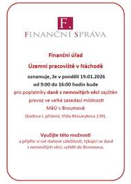 Finanční úřad v Náchodě oznamuje, že v pondělí 19. ledna 2026 bude ve velké zasedací místnosti MěÚ v Broumově zajištěn provoz pro poplatníky daně z nemovitých věcí. Provoz bude probíhat od 9:00 do 16:00 hodin.