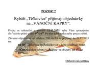 Oznamujeme občanům, že v naší obci probíhá pravidelné odkalování DČOV. Technik fa. AB Plast bude majitele nemovitostí telefonicky kontaktovat s informací termínu odkalování. Informujeme občany, že v období od 8. do 14.prosince 2025 bude v naši obci pracovník pan Pavel Novák opisovat vodoměry pro podklady platby vodného za druhé pololetí roku 2025. Oznamujeme občanům, že se v pátek 5.prosince 2025 uskuteční odvoz plastů. Řádně uzavřené ŽLUTÉ PYTLE odkládejte na obvyklých odvozových místech. Rybáři Těškovice přijímají objednávky na VÁNOČNÍ KAPRY. Prodej se uskuteční v pondělí 22.prosince 2025. Ryby Vám budou zpracovány dle Vašeho přání v čase od 9.00 do 16.30 hodin. Po této době budou ryby pouze zabité. Závazné objednávky se zálohou 200,- Kč se přijímají do 20.prosince 2025 na Obecním úřadu Těškovice u paní Řeháčkové v době úředních hodin, nebo každou sobotu v ,,Šupině“ u obsluhy od 8.00 do 10.00 hodin. Občerstvení zajištěno.