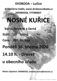 Firma Svoboda Lučice pořádá prodej nosných kuřic, které se uskuteční v pondělí 16. března 2026 v 14:10 hodin u Obecního úřadu ve Dřeveši. Nabídka zahrnuje kuřice stáří 20 týdnů v barvách červená-Isa brown a černá-Morávia. Cena za kus činí 285 Kč.