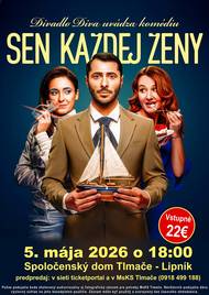 Dámy, poznáte ten pocit, keď si predstavíte svojho ideálneho muža? A páni… radšej ani nechcete vedieť, čo všetko sa v tých predstavách skrýva. Do Tlmač prichádza komédia SEN KAŽDEJ ŽENY, ktorá vás zaručene pobaví a možno aj trochu odhalí tajomstvá mužsko-ženského sveta. Čo sa stane, keď sa realita stretne s očakávaniami? A je vôbec možné byť „dokonalým“ partnerom? Príďte sa presvedčiť na vlastné oči a užiť si večer plný humoru, situácií zo života a skvelých hereckých výkonov.Doprajte si príjemný večer s divadlom a dobrou náladou – možno zistíte, že sen každej ženy je niekedy bližšie, než si myslíte. ➡️ Kedy: 5. mája 2026 ➡️ Čas: 18:00 ➡️ Miesto : Spoločenský dom Tlmače- Lipník ➡️ Vstupenky: predpredaj v sieti ticketportal a MsKS Tlmače ( 0918 499 188) ➡️ Cena : 22,00 € Tešíme sa na Vás!