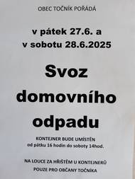 OBEC TOČNÍK POŘÁDÁ ! výhradně pro občany Točníku ! V SOBOTU 28.6.2025 !Navážet možno v pátek od 15h, do soboty 11h! SVOZ NEBEZPEČNÉHO ODPADU . NA LOUCE ZA HŘIŠTĚM U KONTEJNERŮ . Jedná se o pneumatiky, ne od traktoru! Staré barvy, oleje a obaly od nich. Vyřazené elektrospotřebiče, zářivky, baterie, televizory, PC, ledničky. Vše proběhne za dohledu osoby, pověřené ob. ú.