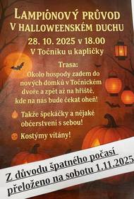 1.11.2025 v 18 hod. v Točníku u kapličky Trasa: Okolo hospody do nových domků v Točnickém dvoře a zpět až na hřiště, kde nás bude čekat oheň! Takže špekáčky a nějaké občerstvení s sebou! Kostýmy vítány!