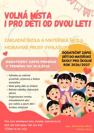 Před 1 měsícemHlášení dne 9. březnaOznamujeme občanům, že od 9. do 16. března vybírají poplatky za svoz komunálního odpadu, stočné, poplatek za psa a zpravodaj obce. Poplatky můžete uhradit v hotovosti v kanceláři OÚ v úředních hodinách: Pondělí a středa 8:00-12:00 a 13:00-17:00 nebo bezhotovostní úhradou poukázat příslušnou částku na účet obce. Jako variabilní symbol je nutné uvést číslo popisné nemovitosti, za kterou dle vyhlášky obce poplatek hradíte. Po připsání platby na účet obce vám bude doručena známka na popelnici. Drůbežárna Prace bude v pátek 13. 3. v 15:00 hod. prodávat: mladé kuřice a kohouty, krmivo pro drůbež a králíky, vitamínové doplňky a dále pak vykupovat králičí kožky - cena 10 Kč/ks. Ředitel Základní školy a Mateřské školy Moravské Prusy, příspěvkové organizace v souladu s § 34 zákona č. 561/2004 Sb. vyhlašuje: ZÁPIS dětí do mateřské školy pro školní rok 2026/2027, který se bude konat v pondělí 13. dubna 2026 od 10,00 do 15,00 hodin v prostorách MŠ. K zápisu si přineste: ● vyplněnou žádost + evidenční list s potvrzením o zdravotní způsobilosti dítěte ● rodný list dítěte ● občanský průkaz rodičů nebo zákonného zástupce Rodiče si žádost a evidenční list dítěte mohou stáhnout na webových stránkách msprusy.cz, v záložce “pro rodiče“, sekce “dokumenty ke stažení“ nebo „informace k zápisu“. Zde jsou uvedena i kritéria pro přijímání dětí. Bližší informace u zástupce ředitele pro MŠ p. Kandorfové na tel. čísle: 792 414 939 nebo prostřednictvím emailu: msprusy@email.cz