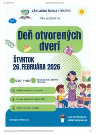 Základná škola Toporec pozýva všetkých na Deň otvorených dverí, ktorý sa uskutoční vo štvrtok 26. februára 2026. Program zahŕňa ukážky vyučovacích hodín a tvorivé dielne pre mladých.