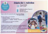 Základná škola Toporec oznamuje zápis do 1. ročníka pre deti narodené od 1. septembra 2019 do 31. augusta 2020, ktorý sa uskutoční 17. apríla 2026 od 9:00 do 12:00.