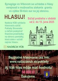 Synagóga vo Vrbovom sa uchádza o hlasy verejnosti s možnosťou získania grantu vo výške 50.000 € na jej obnovu. Ako hovorí staré múdro: Babka k babce, budú kapce. Pomôcť môžete i Vy a nič Vás to nebude stáť :-)
