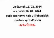 Ve čtvrtek 15.02.2024 a v pátek 16.02.2024 bude sportovní hala v Třebenicích z technických důvodů UZAVŘENA.