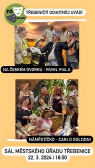 Třebeničtí ochotníci zvou na představení hry Pavla Fialy - "Na českém dvorku" a hry Carla Goldoniho "Náměstíčko" dne 22.3.2024 od 18.50 v sále MěÚ Třebenice.