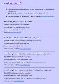 Adventní trhy Olomouc - sobota 13. 12. 2025 Termální lázně Bük, Maďarsko, 34 bazénů a 10 typů saun - úterý 30. 12. 2025 Jednodenní lyžování v Rakouském středisku Stuhleck - sobota 31. 1. 2026 Jednodenní lyžování v Rakouském středisku Hochkar - sobota 28. 2. 2026