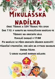 Obec Třeboc s SDH Třeboc Vás zvou na Mikulášskou nadílku, která se uskuteční v sobotu dne 6.12.2025 v Třeboci na sále OÚ, v 17:00 hod. dorazí Mikuláš, po nadílce se bude rozsvěcet vánoční stromeček za zvuků koled v podání mistra pana Ondřeje Hájka.