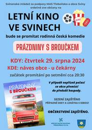 Co má společného letní kino ve Svinech a MALÝ LEADER? Velmi mnoho! Díky projektu Svinenské mládeže, který uspěl v dotační výzvě Malý LEADER Místní akční skupina Třeboňsko o.p.s. se občané Svinů mohou těšit na již druhé promítání nového letního kina.