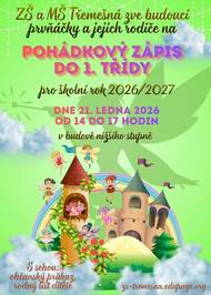 ZŠ a Mš Třemešná, zve budoucí prvňáčky a jejich rodiče na "Pohádkový zápis do první třídy", pro školní rok 2026/2027 dne 21.ledna 2026 od 14 do 17 hodin v budově nižšího stupně. S sebou občanský průkaz rodiče a rodný list dítěte.