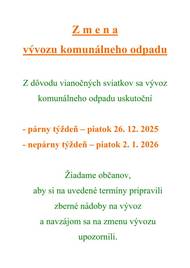 Radi by sme Vás informovali o zmene vývozu komunálneho odpadu z dôvodu vianočných sviatkov.