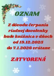 Obecná knižnica v Trenčianskej Teplej oznamuje, že z dôvodu čerpania riadnej dovolenky bude knižnica v dňoch od 19.12. 2025 do 7.1.2026 ZATVORENÁ.