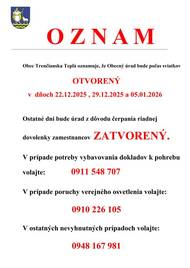 Obec Trenčianska Teplá oznamuje, že Stavebný úrad bude v dňoch od 17.12.2025 do 6.1.2026 z dôvodu čerpania riadnej dovolenky ZATVORENÝ.Ďakujeme za pochopenie.