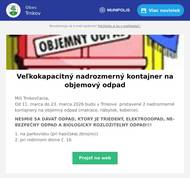Milí Trnkovčania, Od 11. marca do 23. marca 2026 budú v Trnkove pristavené 2 nadrozmerné kontajnery na objemný odpad (matrace, nábytok, koberce). NESMIE SA DÁVAŤ ODPAD, KTORÝ JE TRIEDENÝ, ELEKTROODPAD, NEBEZPEČNÝ ODPAD A BIOLOGICKY ROZLOŽITEĽNÝ ODPAD!!! 1. na parkovisku (pri hasičskej zbrojnici) 2. pri rodinnom dome č. 16