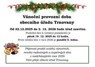 Oznámení o vánočním uzavření obecního úřadu Obecní úřad Trnovany informuje občany, že v období od 22. 12. 2025 do 2. 1. 2026 bude úřad z důvodu vánočních svátků uzavřen. Posledním dnem pro vyřízení úředních záležitostí je pátek 19. 12. 2025 do 12:00 hodin. Prvním úředním dnem v roce 2026 bude pondělí 5. 1. 2026. Děkujeme za pochopení. Obecní úřad Trnovany