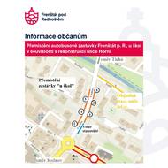 DOČASNÉ PŘEMÍSTĚNÍ AUTOBUSOVÉ ZASTÁVKY FRENŠTÁT p. R., u škol V SOUVISLOSTI S REKONSTRUKCÍ ULICE HORNÍ V souvislosti s opravou silnice II/483 první etapa v části ulice Horní ve Frenštátě pod Radhoštěm bude přemístěna autobusová zastávka FRENŠTÁT p. Radh., u škol v obou směrech na ulici 6. května před první kruhový objezd do prostoru podélných parkovacích stání. Termín: 05.05.2025 (pondělí) – 01.06.2025 (neděle)