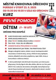 Knihovna Ořechov pořádá kurz první pomoci pro děti ve věku 1-18 let, který se koná 23. září 2025 od 15:30 do 19:30 hod. Kurz povede Mgr. Martin Skácelík a je určen pro dospělé zájemce o praktické dovednosti v oblasti první pomoci.