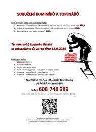 Sdružení kominíků a topenářů bude provádět v naší obci ve ČTVRTEK dne 11.9. požadované kontroly a čištění komínů dle zákonu č. 34/2016 Sb. za následující ceny: - Čištění komínů: 450 Kč - Čištění plynových kotlů: 450 Kč - Revize kotlů na tuhá paliva: 1.300 Kč