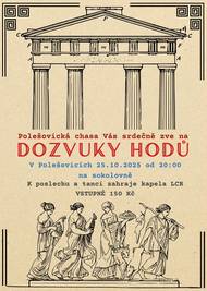 Polešovická chasa Vás srdečně zve na Dozvuky hodů, které se konají v Polešovicích 25. října 2025 od 20:00 v sokolovně. Na akci zahraje kapela LCR a vstupné činí 150 Kč.
