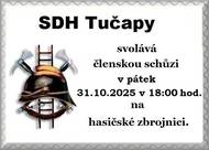 Sbor dobrovolných hasičů Tučapy svolává všechny své členy na schůzi, která se uskuteční v pátek 31. října 2025. Schůze začne v 18:00 hodin a koná se v prostorách hasičské zbrojnice. Všichni členové jsou srdečně vítáni.