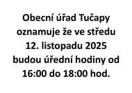 Obecní úřad Tučapy oznamuje že ve středu 12. listopadu 2025 budou úřední hodiny od 16:00 do 18:00 hod.