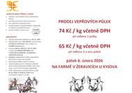 Farma Žeravice nabízí prodej vepřových půlek za cenu 74 Kč/kg včetně DPH při odběru 1 půlky, při odběru dvou a více půlek za cenu 65 Kč/kg. Závazné objednávky se přijímají do 28. 1. 2026. Odběr půlek proběhne v pátek 6. 2. 2026.