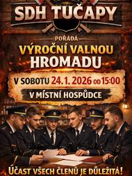 bor dobrovolných hasičů Tučapy pořádá výroční valnou hromadu, která se uskuteční v sobotu 24. ledna 2026 od 15 hodin v místní hospůdce. Žádáme všechny členy SDH Tučapy o účast, která je velmi důležitá.