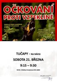 V sobotu 21. 3. 2026 od 9.15 do 9.30 hod. se budou před obecním úřadem očkovat psi proti vzteklině.