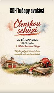 Sbor dobrovolných hasičů Tučapy svolává všechny své členy na schůzi, která se uskuteční ve čtvrtek 26. března 2026. Schůze začne v 18:30 hodin a koná se v prostorách hasičské zbrojnice. Všichni členové jsou srdečně vítáni.