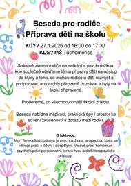 Srdečně zveme rodiče na setkání s psycholožkou, které se zaměří na přípravu dětí na nástup do školy. Společně se podíváme na to, jak mohou rodiče u dětí podporovat přirozené dozrávání a školní připravenost v každodenním životě.