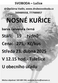 Firma Svoboda Lučice bude prodávat ve středu 23.4., ve 12:15 hodin u OÚ nosné kuřice, stáří 19 týdnů, cena 275Kč/kus. Objednání je možné na tel. 569 489 358 nebo emailem svoboda.lucice@seznam.cz. Více info na stránkách www.drubezsvoboda.cz