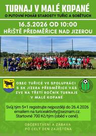 Obec Tuřice zve všechny muže a ženy, chlapce a dívky starší 15 let k účasti na 3. ročníku turnaje v malé kopané o putovní pohár starosty Tuřic a Sobětuch.