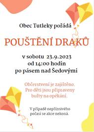 Obec Tutleky pořádá POUŠTĚNÍ DRAKŮ v sobotu 23.9.2023 pod pásem nad Šedovými od 14:00 hodin. Občerstvení je zajištěno. Pro děti jsou připraveny buřty na opékání. V případě nepříznivého počasí se akce nekoná.
