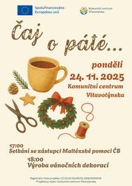 Komunitní centrum Vltavotýnska ČAJ O PÁTÉ… se zástupci Maltézské pomoci z Českých Budějovic. Program bude pokračovat výrobou adventních a vánočních dekorací.