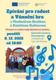 ZPÍVÁNÍ PRO RADOST S VÁNOČNÍ HROU Komunitní centrum Vltavotýnska (Jiráskova ul. 39, Týn nad Vltavou) Přijďte si zazpívat s Vladimírem Hruškou a Kateřinou Rušínovou. Vezměte si s sebou drobný dárek na výměnu.