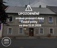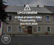 Vážení občané, upozorňujeme na změnu provozní doby České pošty ve dne 13.01.2026. Pošta bude otevřena od 12:00 do 15:00 hodin. Děkujeme za pochopení.
