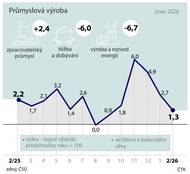 Praha - Český statistický úřad (ČSÚ) dnes zveřejní výsledky průmyslu a stavebnictví za letošní únor. V lednu průmyslová produkce zpomalila meziroční růst na 2,8 procenta a stavební výroba po 14 měsících růstu v řadě meziročně klesla o 1,5 procenta.