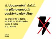 Upozorňujeme občany na plánované přerušení dodávky elektřiny v ulici 1. máje č.p. 47 až 53 v pondělí 19. 1. 2026 od 8:30-15:30 hodin.