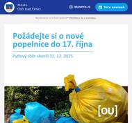 Usti nad Orlici: Mesto Usti n. Orlici informuje o vydeji novych popelnic na trideny odpad: 11. 12., 14-18 h, 13. 12., 8-12 h, Knapovec - hasicska zbrojnice (49.95838,16.44491). Pri vymene nadoby na smesny odpad musi byt puvodni popelnice dovezena na vydejni misto Knapovec - hasicska zbrojnice prazdna a cista. Dekujeme.