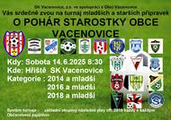 SK Vacenovice, z.s. ve spolupráci s Obcí Vacenovice tímto zvou na turnaj ml. a st. přípravek a ml. žáků O pohár starostky obce. Akce se koná v sobotu a v neděli 14.- 15. června 2025 na hřišti SK Vacenovice od 8:30.