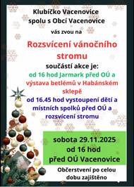 Klubíčko a OÚ Vacenovice Vás zvou na tradiční předvánoční akci v sobotu 29.11.2025 od 16 h před OÚ. Součástí je vystoupení místních dětí a spolků, jarmark, výstava betlémů a něco dobrého je také přichystáno. Těšíme se na Vás.