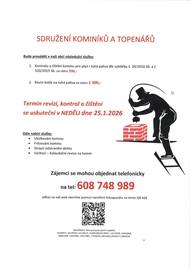 Sdružení kominíků a topenářů bude provádět v naší obci v NEDĚLI dne 25.1. požadované kontroly a čištění komínů pro plyn i tuhá paliva dle zákonu č. 34/2016 Sb. Zájemci se mohou objednat telefonicky na telefonním čísle: 608 748 989.V