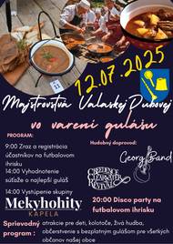Srdečne všetkých pozývame na Majstrovstvá Valaskej Dubovej vo varení gulášu, ktoré sa uskutočnia 12.07.2025 od 9.00 hod na futbalovom ihrisku.