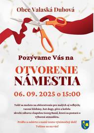 Obec Valaská Dubová Vás srdečne pozýva na otvorenie námestia, ktoré sa uskutoční v sobotu 6. septembra 2025 o 15.00 hod